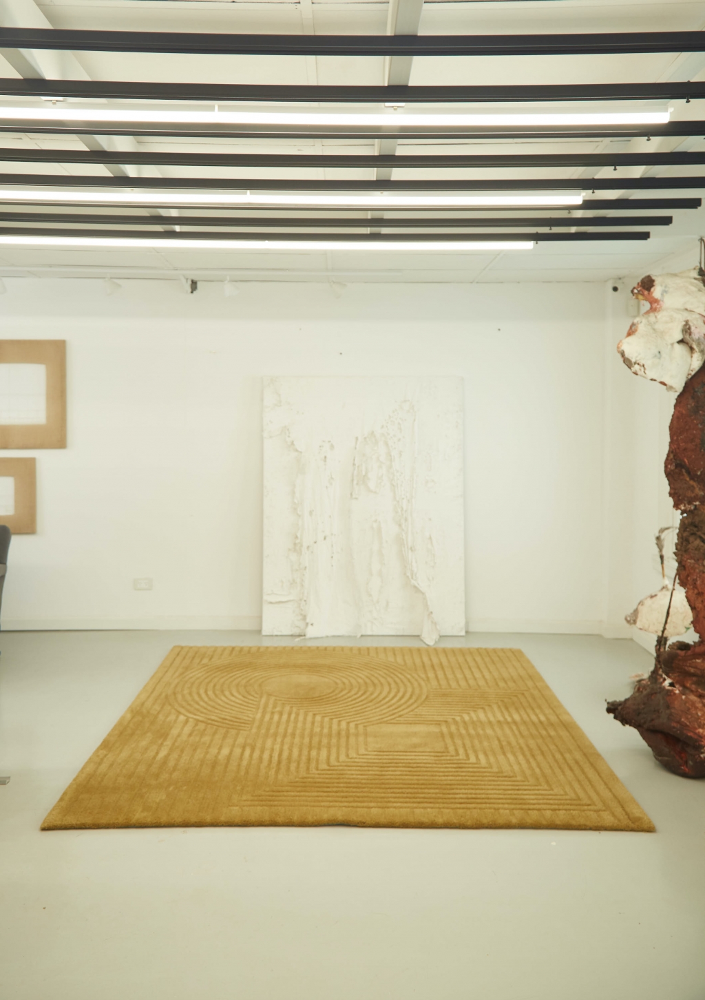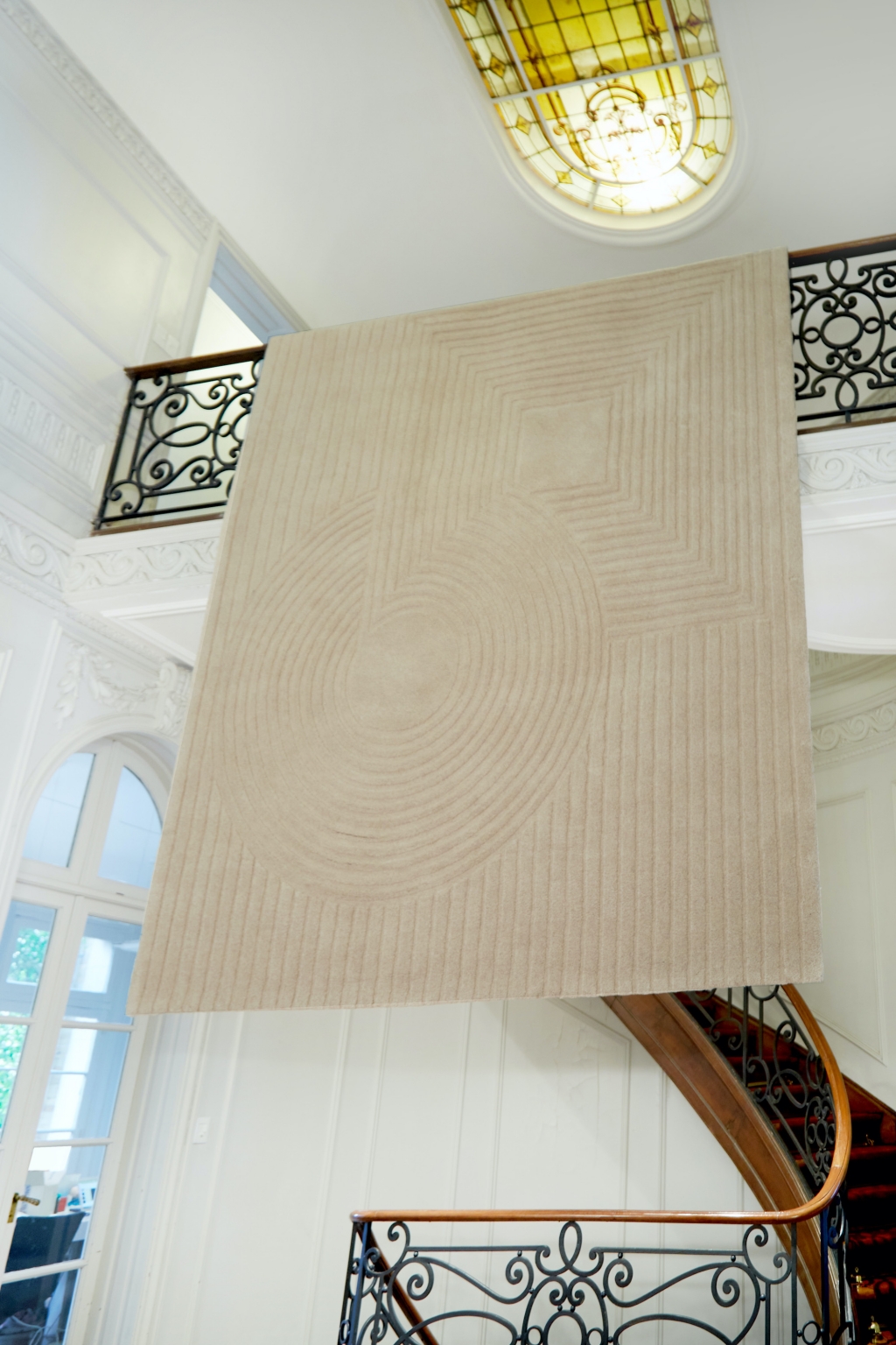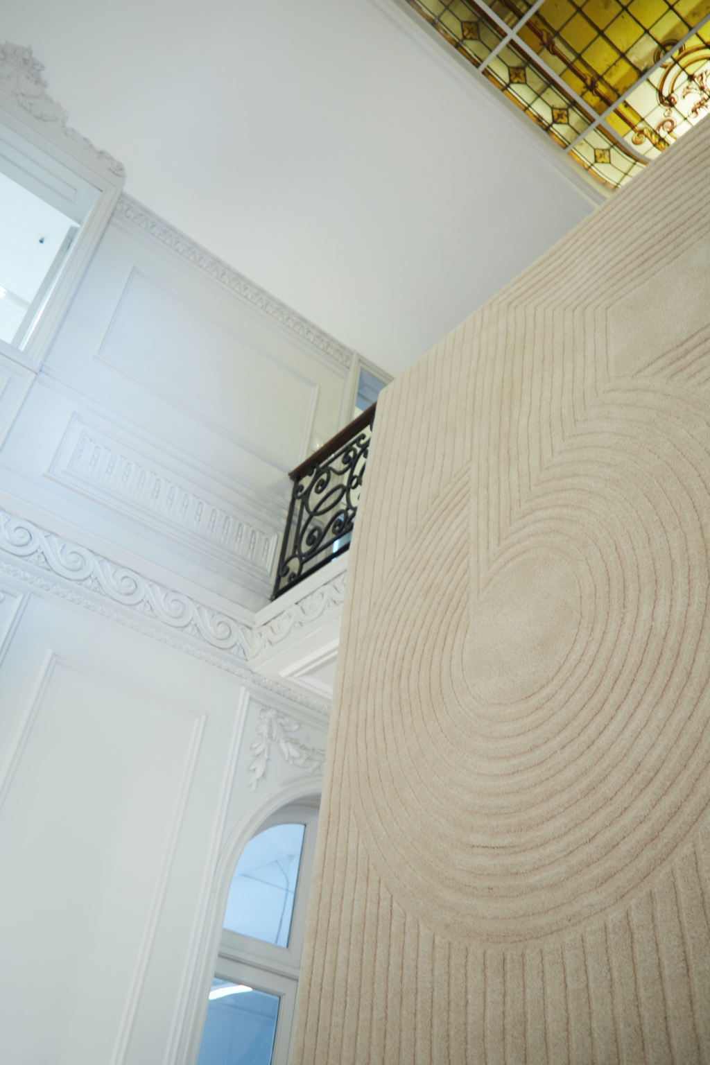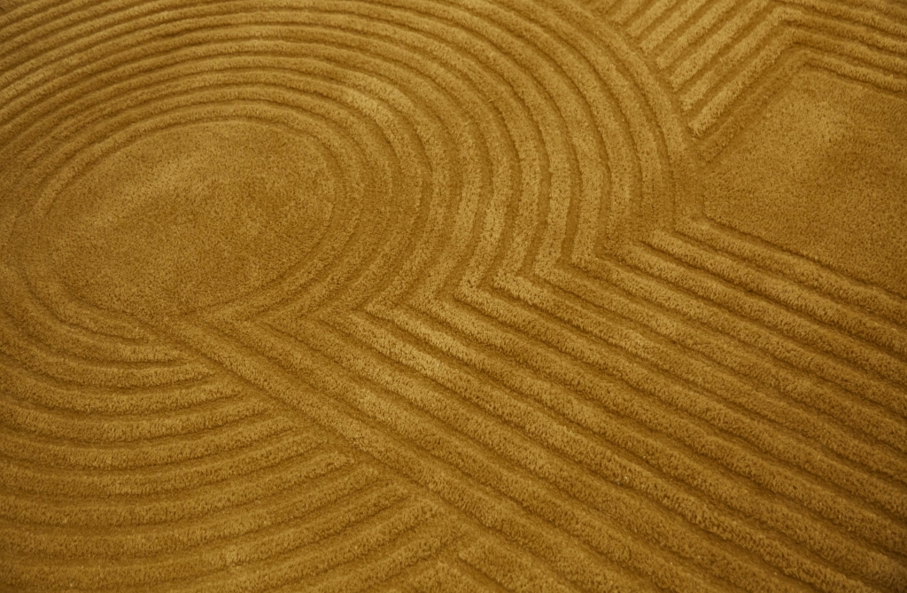 Hand tufted and hand carved in New Zealand wool. “Big in Japan” is a zen garden-inspired design meant to bring a sense of calmness and well-being.
